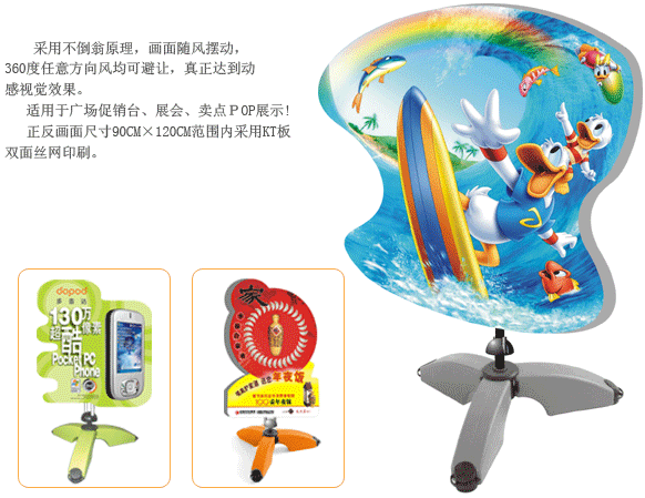 该产品采用不倒翁原理,画面随风摆动,360度任意方向风均可避让,真正达到动感视觉效果。 适用于广场促销台、展会、卖点POP展示! 正反画面尺寸90CM×120CM范围内采用KT板双面丝网印刷!……