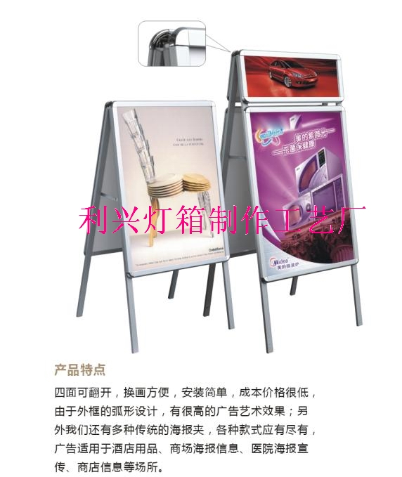四面可翻开,换画方便,安装简单,成本价格很低,由于外框的弧形设计,有很高的广告艺术效果;另外我们还有多种传统的海报夹,各种款式应有尽有,广告造用于酒店用品,商场海报信息、医院海报宣传、商店海报信息等场所