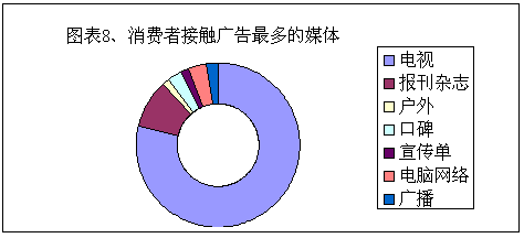 在笔者对此进行的调查中显示,电视仍然是区域消费者接触广告最多的媒体,占比例78.6%;其他依次为:报刊杂志9.9%,户外1.4%,口碑2.8%,宣传单1.5%,电脑网络1.5%,广播2.1%。