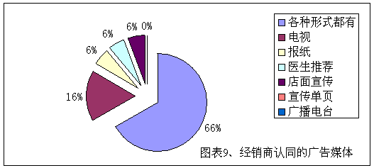 区域市场的一线经销商可谓是与消费者接触最多、对当地媒体和其他厂家的了解也非常本地化,因此,经销商的意见是很有必要供企业参考和深思的。在笔者进行的调查中,有66%的经销商认为医药保健品的媒体选择应该“多种多样”,16%的经销商认为“电视”乃首选媒体,各占6%的经销商则分别认为厂家的媒体选择应该考虑:报纸、医生推荐、店面宣传(POP)等。总体来看,单纯哪一种媒体的作用都是利弊共存的,而要在区域市场抢占尽可能多的市场,企业则有必要结合区域市场的发达程度,在电视、报纸、宣传小报、广播等媒体间,根据实际情况“自助搭配”。