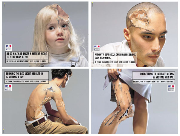 [点评] 除却成功的执行力,沟通的成功是这套广告的另一个出彩之处,如果使用真实的人虽然能造成更强的视觉冲击力,但容易失去公益本身所应该具有的正面力量和感召力,两者最终的沟通效果也高下自分。这也是2003.ADCE欧洲艺术指导俱乐部获奖作品。