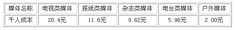 风驰传媒是以户外媒体起家,云南省户外广告占有率约70%,多年来主营业务始终是户外媒体,这可是风驰传媒安身立命的本钱,由此我们可以推定风驰传媒选择的市场应该是那些愿意且有能力投放户外媒体广告的客户,户外广告虽然不像电视、报纸那样深入城乡小巷几乎无处不在,但随着人们生活习惯的改变,户外广告成为人们接触最多的媒体,人们80% 的时间花在户外,在同类媒体的比较中CPM(千人成本=广告费用/受众人数×1000)是较低的。(见下表)