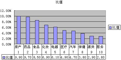 我们来进行一个比较分析,以2004年度为例,首先来看全国广告市场的投入分布情况分析数据统计,下表是2004年广告投放前十的行业排名(图示三):