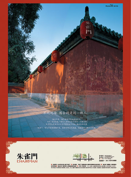 “朱雀门”位于500年皇家地脉中,这在北京地产项目中,属于独一无二的地脉资源,在经过深入的研究分析之后,本案的推广策略得到明确,即“在对于历史文化的回溯中,挖掘地脉附加值,在组合建筑元素中,实现历史与现代的对话。”