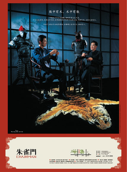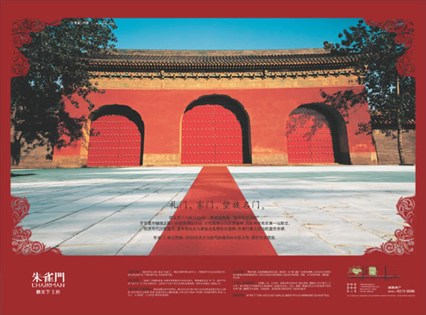 实际创作过程中,“朱雀门”不去空喊“弘扬国粹”,也不会空喊“西化”,而是将中西文化的情感模式、居住模式作具体、深入、细致地介绍、比较、分析和讨论,来重新思考中西文化交流后的真正意义。广告创意系列采用了“新儒家文化精神的外在表现”为创意原点,表达了目标客群“对仁义的态度与信念所表现出的行为方式”—— “礼”(“礼”来自儒家五常系统即“仁、义、礼、智、信” )。中国号称礼义之邦,中国人也素来以此标榜自己的传统特征。“礼”是中国文化和儒家思想最为重要的基本范畴和观念。