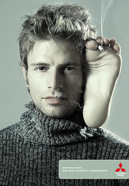 创意乱讲:用脚抽烟,手到哪里去了呢?三菱Montero越野车,完美体验,让男人的双手无法离开方向盘。想法有够大胆,吸烟的男人形象与越野车的产品之间,也颇有共同的地方,只是这张大脚丫子让小编看了颇是有些不悦啊,不知各位感觉如何?