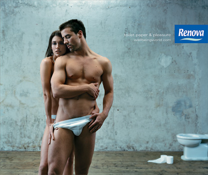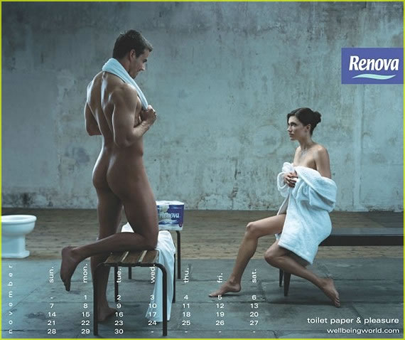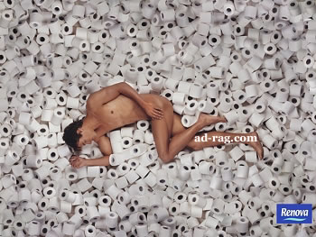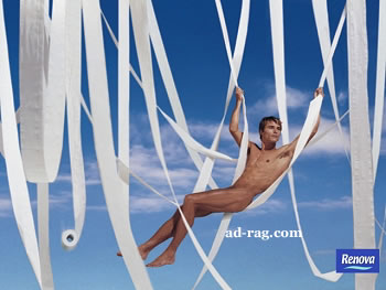 renova卫生纸的广告特点分别是由柔软(裸男睡觉)、芳香(裸男嗅卫生纸)、韧实(裸男荡秋千)、吸收(“海洋”那张)与及亲肤(“裸男+裸女” 和 “站立的裸男”),但是,最重要的一点也许大家留意到小编没说,呵呵...不错,就是家用卫生纸购买的权利由女性掌控,卫生纸广告也通常由女性代言。但renova为什么要用男人打广告咧?其实有两方面原因:第一男性自古以来便是力量与粗旷的代表,用男性来打广告是形成一种对比关系,也更容易深入民心。第二是男士关注卫生纸较少,广告一破往日风格,定位在“男人也喜欢的卫生纸” ,男人都爱的卫生纸女人怎么会不爱咧?呵呵......