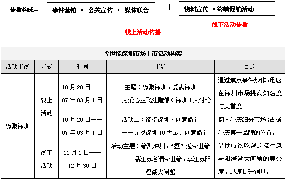 2、婚庆市场作为一个有利市场不能丢;但同时也不能局限在里面。活动以“缘聚深圳”为主线在婚庆、商务二大重点市场集中资源进行突破,将线上传播与线下传播有机结合,空中与地面相互配合,提高传播的有效率。