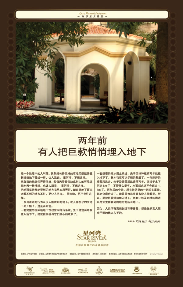 一套缜密的散水固土系统,先于园林种植前两年前两年就植入地下了。林木花草可以尽情的舒展了。一列排开的暗敖泻洪井,先于沿渠景观改造前两年,深植于水下河床8m了,不管什么季节,水面都永远不会超过1.8m了。两年后的今天,所有社区里的一切实现事物,充分磨合过了。就是因为这些装备没人能看见。所以,要把巨款提前埋入地下,而且还涉及到社区周边凡是业主能看到的地方的所有地下。