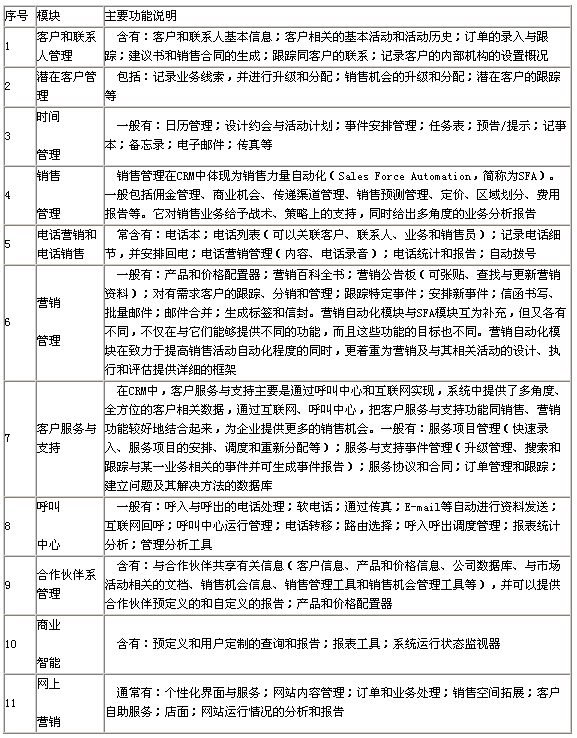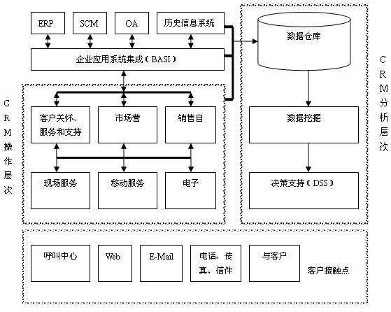 从体系结构角度看,整个CRM的系统结构可以分为三个关键部分:(1)操作层次的CRM:用于自动地集成商业过程,包括对销售、营销和客户服务三部分业务流程的信息化,客户接触点、渠道、前后端的集成;(2)分析层次的CRM:用于操作层次的CRM和客户互动产生的信息的分析处理,通过基于数据仓库的数据挖掘所产生商业智能以支持企业战略和战术的决策,包括:客户服务支持、客户市场细分、客户变动分析、交互和垂直销售分析、新客户模型、客户接触最优化、广告分析、信用风险得分、客户生命周期价值模型等;(3)CRM的客户互动:关注客户接触点的交互,即与客户进行沟通所需要的手段(如呼叫中心、网络、电话、E-Mail等)的集成和自动化处理。