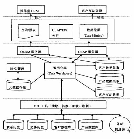 在系统结构中,底层为数据源,包括联系历史、交易历史、客户数据库、产品数据库及其他外部数据,通过ETL工具提取数据形成数据仓库和数据集市,以形成面向全局的数视图,从而形成整个系统的数据基础;在此基础上,通过OLAP和PLAM服务器支持数据分析处理包括查询/报表、OLAP/EIS分析和数据挖掘分析;将分析结果用于操作型CRM和客户互动渠道,以实现企业客户关系管理中的商业智能和决策支持。