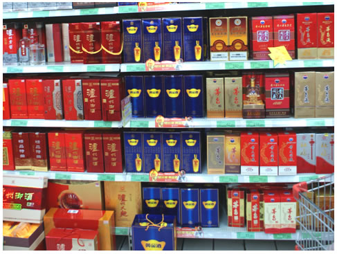 在一片红色包装的酒类柜台,简洁干净的蓝色成为鹤立鸡群的最突出品牌。