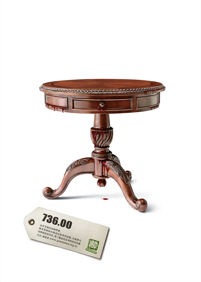 客户:绿色和平组织 广告公司:北京奥美广告 创作总监:安德笙 /谢福东 文案:谢福东 / 赵斐 美术指导:于鹏 简介描写:736 去年灭绝的动物种类。购买雨林树木做成的家具和地板,无数野生动物就因你而死去。