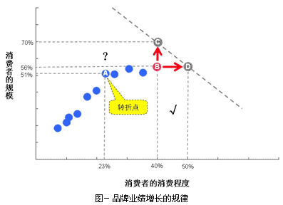 发展到A点之前,这个品牌的发展主要靠的是不断扩大消费者的规模(渗透率),这一点非常明显;而从A点开始到B点,它主要靠的是提升消费者的消费程度(购买量),这一点也非常明显。