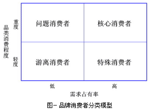 不过,不管你通过什么工具,得到下面矩阵里的消费者比例和他们的属性是更重要的,即:通过消费者对品类的消费程度和对品牌的消费程度(品牌占品类需求的比率,就是“需求占有率”)来衡量你的消费者到底分布在哪个象限、他们是什么样的人群(如下图)。