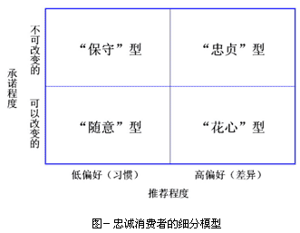 因此,我们把消费者的在乎程度用“推荐率”来表示,把稳固程度用“承诺率”来表示,这样就把消费者再细分为以下四大类(如下图),即:“忠贞”型消费者、“花心”型消费者、“保守”型消费者和“随意”型消费者。