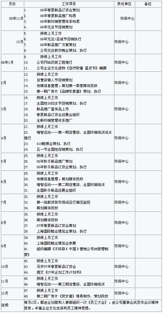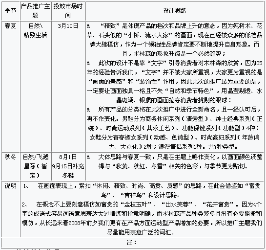 根据企划部2004年提交公司的《2005年企划部工作思路及工作计划》,在05年企划部的工作也经历了近一年,整个部门在一年工作期间人员得到了充实,经验也有了长足的进步。自2005年春夏季产品订货会以来,我们先后对“木林森”品牌所推广的“环保、健康、舒适、都市休闲、商务休闲鞋专家”的核心理念,分析出众多的品牌口号用词上不够新颖、不能表达品牌的情感、产品特性、或是在词语上缺乏时代感,不能与时俱进。调整方向后,我们选用了既与商标密切相关,又有时代感,且不过时的“自然”理念,并且通过产品推广得到了来自全国办事处和公司领导的认同。