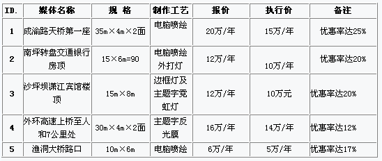 汽车品牌越来越加大对户外广告的投入,短期临时的户外广告更是小投入,大回报;户外广告的发布一般都以年为单位,发布价格也都以数十万计,而公司可以提供1-2个月的发布期限的户外广告是其他公司不能承担的,且45元/平米/月为市场相对较低的价格,并且如果到期未有其他客户发布要求,我们可以继续保留,因此其超值的效益是可以预期的。