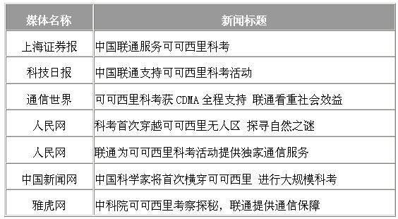 2005年9月中旬至10月下旬,我国科学家将对可可西里地区进行为期40天的大规模科学考察,这次是人类首次在青藏高原腹地可可西里无人区进行的大规模科考探秘活动。中国联通公司以首席合作伙伴和“独家通信支持单位”的身份,为本次科考活动提供了金额高达2000万元的现代化通信设备和通信资源,使此次科考活动拥有了史无前例的通信保障。为了圆满完成此次科考的通信保障,中国联通进行了几个月的精心筹备,为了适应可可西里复杂、恶劣的自然环境和可能遇到的各种突发情况,两辆通信车分别经过了定做和改造。人员上,从14名候选人员中,基于高原适应能力的考验,挑选出跟随科考队进入无人区7人