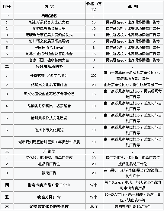 为了保证文化节的顺利开展,多渠道筹集办节经费,同时利用办节有利时机提升城市形象,扩大商品知名度,促进沧州与全国各地乃至世界各地的合作交流,推动沧州经济快速发展和社会全面进步。本着“社会参与、市场运作”的原则,组委会热忱欢迎社会各界积极支持和参与。现将招商事项公告如下: