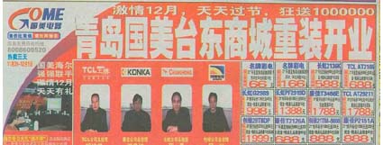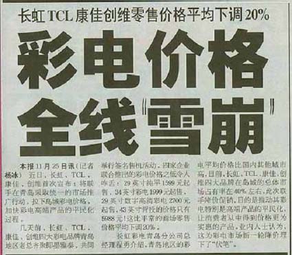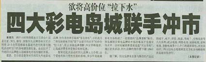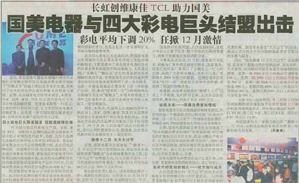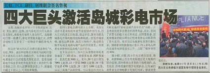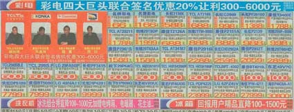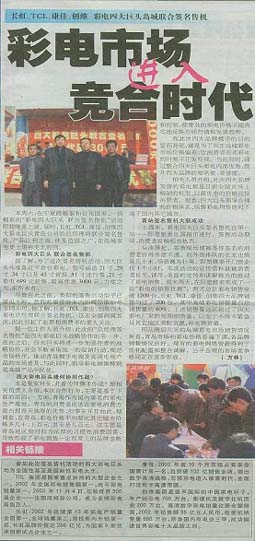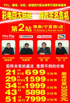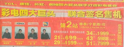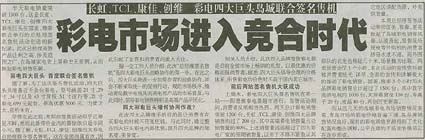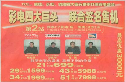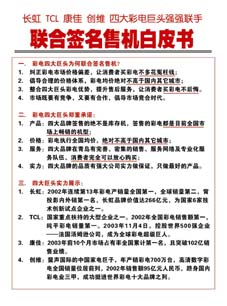 当前位置:中国广告人网站>创意策划>活动方案>详细内容 彩电四大巨头联合签名售机——长虹、TCL、康佳、创维四品牌 作者:智诚灵动 时间:2004-9-10 字体:[大] [中] [小]