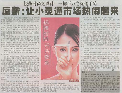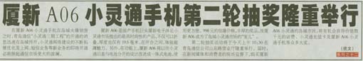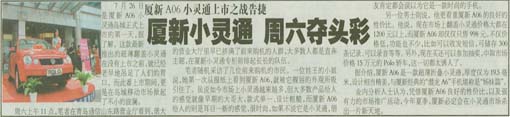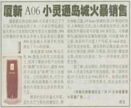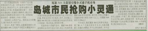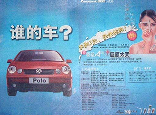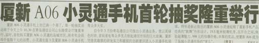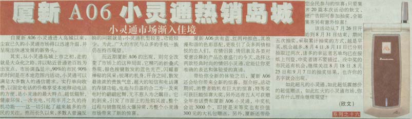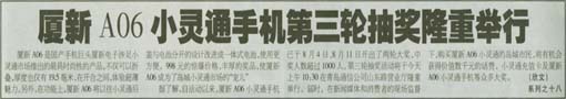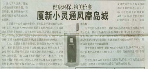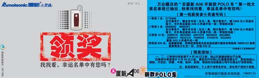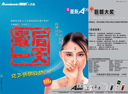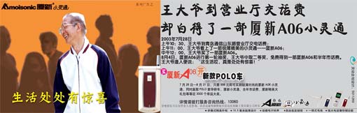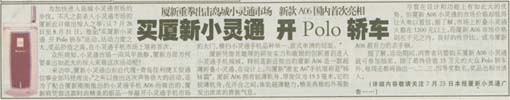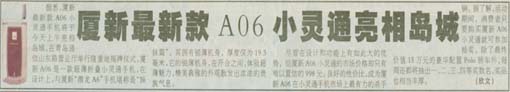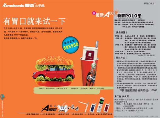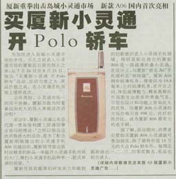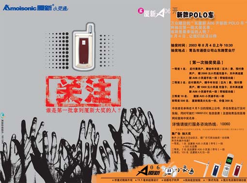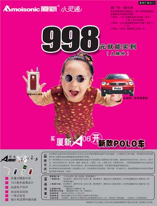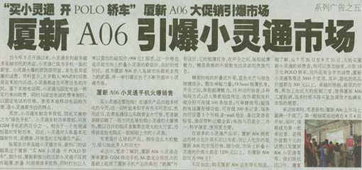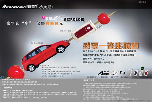 当前位置:中国广告人网站>创意策划>电信企划>详细内容 “买厦新A06 开新款POLO车”暨厦新小灵通青岛上市策划 作者:智诚灵动 时间:2004-9-10 字体:[大] [中] [小]