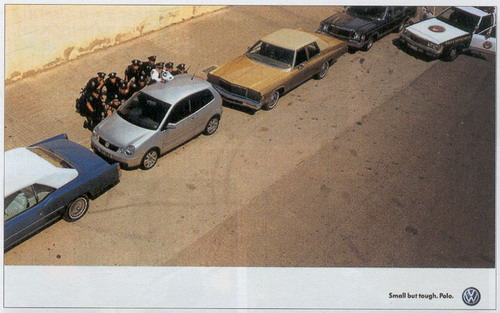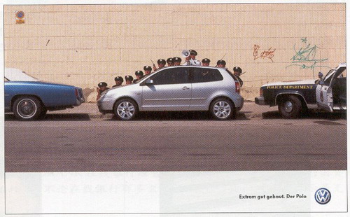 这是德国大众POLO的汽车广告,广告上的经常都躲在了POLO的车身后面用大喇叭在对罪犯喊话,表现这款着的安全性与坚固性!