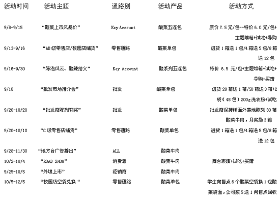 促销品到货慢---许多酸菜的促销品直到9月下旬才陆续到位,之前不得不挪用其他的促销资源。