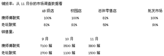 2、 康师傅袋面在NC市月均销量两万箱,目前有7支口味;继现有的红烧牛肉和辣系列以后,公司希望推出酸菜牛肉从而把酸菜、泡椒、酸辣整合为酸系列;