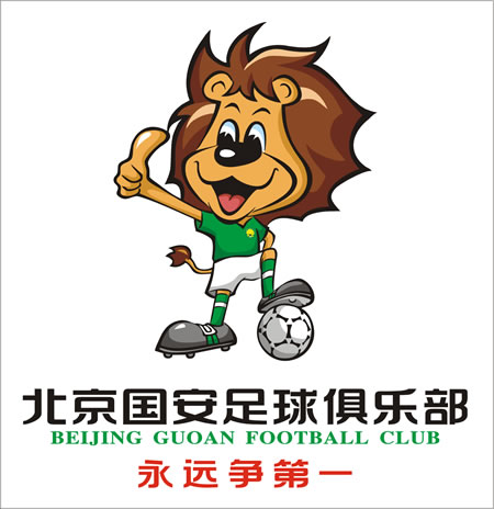 吉祥物“京狮”是一头脚踏足球、英姿飒爽的卡通形象。其充满自信的表情、矫健的身躯极具亲和力;伸出的大拇指既寓意了国安球队感谢广大球迷的支持和拥护,又暗寓了国安力争取得成功的决心。(见图)