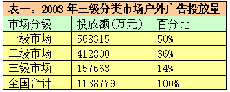 以北京、上海、广州为代表的一级市场占据了全国50%的户外广告市场份额。(见表一)