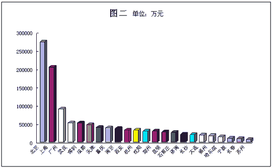 户外广告的投放排期一般较长,多以月和年来计算。从2003年全年投放的季节来看,总体变化不大。除了6-7月份有一个明显的低谷以外,从9月份开始市场快速恢复,到年底时,达到了全年的最高峰。(见图四)