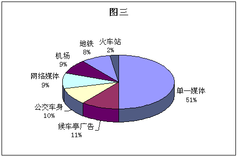 在户外媒体投放类别的选择方面,单一媒体最大,占51%。其他几类户外媒体竞争相当激烈,彼此差距不大。地铁广告的份额从以往的6%提高到了8%,增长速度最快。(见图三)