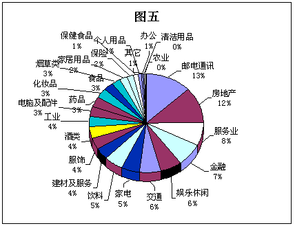 在行业大类里,邮电通讯以13%高居榜首,其次是房地产行业,达到12%。占5%-10%之间的行业分别是服务业、金融、娱乐休闲、交通、家电和饮料。