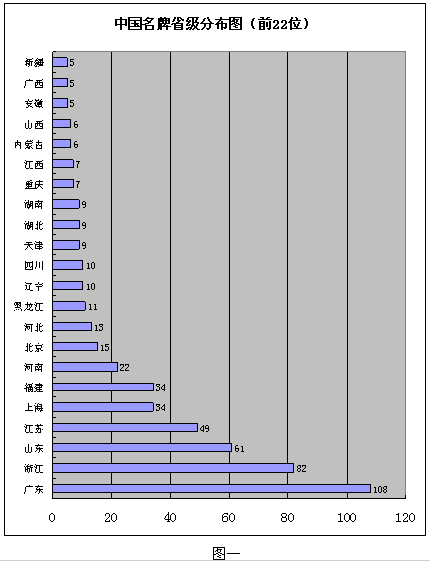 如图一所示,目前中国名牌最多的五个省市为:广东、浙江、山东、江苏、福建和上海,分别为108、82、61、34和34个,差异也很大。尚没有中国名牌的有青海和西藏(不包含港澳特区和台湾省),中国名牌数量在5个以下的有陕西、云南、吉林、贵州、海南、宁夏、甘肃,分别为4、4、4、3、2、1和1个。除上海外其它直辖市拥有中国名牌的量分别为北京15个、天津9个和重庆5个。