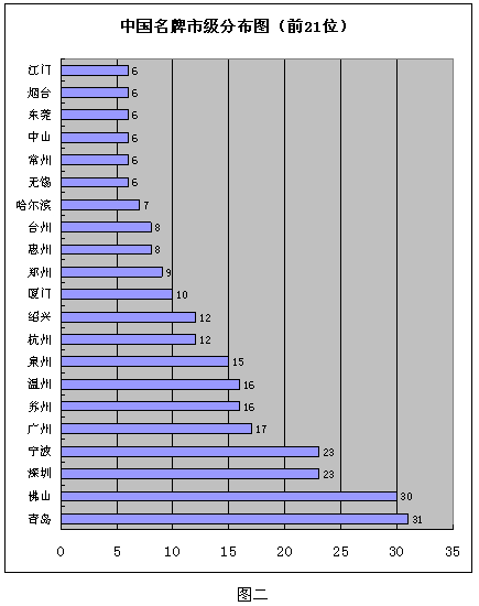 目前在我国总共332个市、地区、自治州(不含四个直辖市)中,拥有中国名牌的有129个,中国名牌数量超过5个的共21个地区,有5个的为南京和潍坊,有4个的共汕头、石家庄、成都、西安、扬州、江阴、济南、威海、嘉兴、金华等10个地区,有3个的共武汉、长春、合肥、福州、长沙、呼和浩特、柳州、临沂、龙岩、绵阳等10个地区,有两个的共昆明、乌鲁木齐、大连等21个地区。