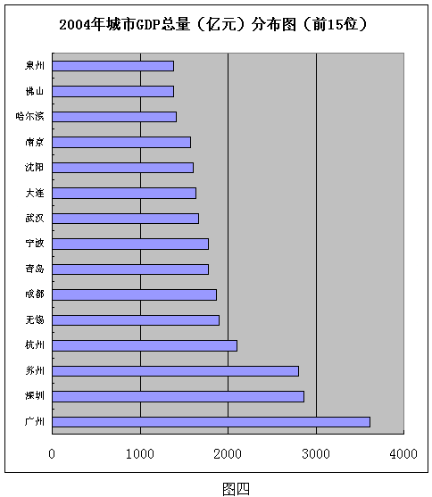 从图三与图一,图四与图五的对比我们就能看出,2004年上半年GDP排名前15个省份名单与中国名牌数量排前15的省份名单,重合的达到14个,而且排前四的广东、山东、江苏、浙江更是完全一致;2003年城市GDP排名前15位(不含四个直辖市)和中国名牌市级地区排名前15位的地区,重合的也高达10个。