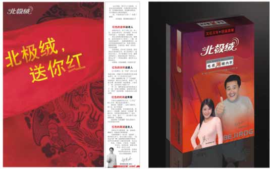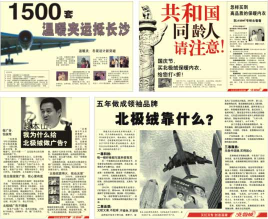 2002年的北极绒平面广告,没有盲目追求画面的漂亮,而是充分利用其深度说服力,除少量硬广告和促销广告外,主要采用平面软文,多角度诠释“又红又专”,谈企业的诚信、深入谈产品的面料、工艺和科技含量。更重要的是,使北极绒的品牌更清晰地凸现出来。