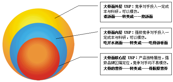 在大骨面USP如何构建上,我们是这样的策略:构建三层式USP,让竞争对手无法模仿,从而使大骨面产品拥有绝对的领导地位。