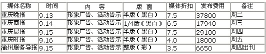 《重庆时报》四家主流媒体和《渝报》做直效的活动传播媒体,并在其他媒体上予以新闻配合。具体发布排期如下: