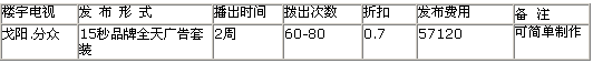 3、楼宇电视形象广告:楼宇电视一般设置在高级写字楼,利用搭乘电梯的间歇抓住人们空余而无聊的视觉注意力,一般出入高级写字楼的都是年轻白领等精英人士,正是本企业所必须锁定的目标顾客,投放楼宇电视形象广告将直接有利于建设企业形象和构建企业的核心简直链。投放计划如下: