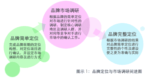 创建往往被称之为“品牌孵化”,即是通过种种创建方案及管理方式使品牌能够快速成长,并能够为市场所接受以至在最短时间内使品牌实现盈利状态。而在品牌的孵化过程中,品牌的定位是品牌何去何从的关键,也是品牌在市场中寻找差异性及塑造品牌的个性化魅力过程。因而,也可以说,服装企业在从批发型向品牌型过渡的过程中,品牌的定位将成为品牌是否成功的主要因素。所谓的品牌定位,如果简单一点阐述也就是:寻找品牌的营销方式及形象体现方式,并通过方式的设置使之合理的切入消费市场。而在进行品牌完整定位之前应先期完成市场的调研工作,市场调研与品牌定位二者之间应是间进式工作状态,其工作表现为图示1中的顺序: