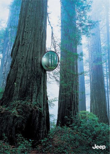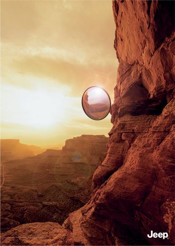 [RK]:弯道上的后视镜,出现在不常出现的地方,以此表现JEEP卓越的越野性能。悬崖峭壁是越野车广告的最爱,广告中虽对性能有明确的表达,但并没有形成独特的差异性,放到哪个越野车上都能用