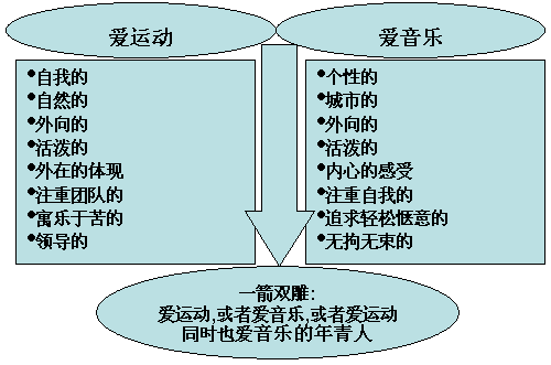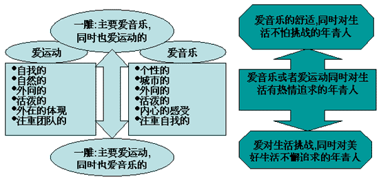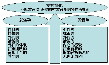 可是,从消费者分析图可看出,爱运动的人的特性与爱音乐的人的特性虽有一些共同点,但更多的是不同的消费者特征,一种更倾向于自我的、自然的、外向的、活泼的、注重团队的、寓乐于苦的甚至领导型的;一种则是个性的、城市的、外向的、追求轻松惬意与无拘无束的。所以,最初的想一箭双雕住这两部分消费者,想夺得大众市场的好感,反而变成了特殊人群的特性装备,目标消费者群变成了: