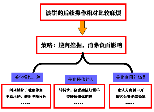 正是本着我们找到了产品真正需要的人,我们开始着手策划思路。通过消费者定性座谈我们发现他们对该产品的反映集中在买到产品的后续加工阶段:要开火、操作过程中要有人看着、对操作者的要求比较高、做完后要刷锅。这些负面意见就是我们解决问题的思路,因此我们也找到了解决问题的策略落点:后续操作较为烦琐的过程就是我们需要深度挖掘的营销内容,因此我们的策略思维就是:反向诉求,将劣势层层化解,在化解过程中提炼产品的附加利益。