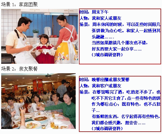 将以上的消费场景推演开来,几处欢快、热闹、休闲、团聚的餐饮场面向我们挪移过来:某公司的几位加班朋友在一家酒楼喝完酒后开始畅谈友情和工作闲聊,几个人聊着开始感觉有些饿,于是问侍者要餐点作为佐餐……;周六晚和亲朋在烧烤店边吃野味边喝啤酒,这时身边的女朋友叫了份开心餐点……;一家人周末团聚,年轻的妈妈为辛劳的丈夫和可爱的孩子准备盛宴,一盘家常菜、两个拼盘、一个海鲜,时尚新吃代替了主食……;其他场景如家里吃早餐时、和朋友家人喝下午茶时、吃宵夜时、逢年过节家庭聚会时、和家人一起吃风味小吃时都会想到把该饼作为佐餐甚至主食。这些食用时的场景都是互动的、欢快的、休闲的、有生活欢快氛围的。因此我们得出该食品典型的两个食用场景:家庭团聚和亲友聚餐。
