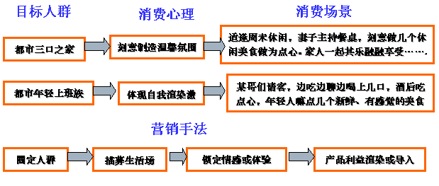 由此思路出发,第一起点就是先找人——消费该产品的具体的人。我们人为地圈定该产品目标消费群体为都市两大细分人群:25-30岁年轻群体,他们的生活形态表现为已经步入工作或婚姻、家庭,既追求时尚、优质生活,又有家庭角色的责任,开始操持家庭事务;31-45岁较年长群体,他们的生活形态基本以家庭为中心,为孩子、爱人操持生活,但同时向往、追求时尚生活。他们的共同特点就是都市人群,乐于接受新鲜事物,开始步入家庭或正在操持家庭,既孜孜追求时尚生活的浪漫和创意,又要处理家庭事务。他们是都市人群,家庭事业风华正茂;个人月收3000以上,家庭月收5000以上,有享受生活的资本;他们追求时尚、创意的挑战生活,跃跃欲试,他们活跃于公司事务、流行场所和家庭事务之间;他们在家庭团聚、在公司聚餐、去流行餐管感受情调;他们每天面临各种美食、肯德基、必胜客、时尚餐点等特色食品包围;他们也参与创意美食的挑战;他们享受生活情调,倾听音乐、追求新奇、沐浴浪漫和温馨。