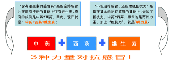至此,金羚感冒片卖点诉求点诞生了:中药+西药+维生素,三种力量对抗感冒!