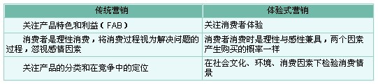 费中、消费后的体验,才是研究消费者行为和企业产品营销的关键,运用企业营销的活动为消费者的购买前、购买后所提供的刺激促成消费者购买行为产生、消费后满足和后续购买行为的持续,其实现的基础在于消费者响应这种刺激并对企业营销活动的直接观察和参与促成。传统营销与体验式营销的区别:
