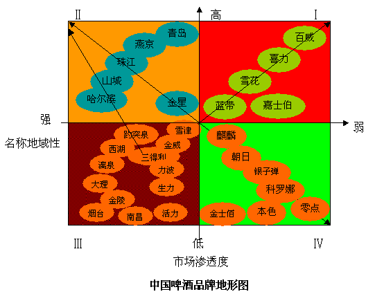 二、 高渗透度、高地域性(第二象限Ⅱ):如青岛、燕京、珠江、山城、哈尔滨、金星、金威等;这个阵营里有两个规模在第一军团的企业(青岛、燕京)以及汲汲于进行全国扩张的企业(珠江、山城、哈尔滨),是最希望将品牌推进到第一象限顶端的品牌,虽然已经有很高的市场渗透度,却始终被品牌的区域印记所困扰;
